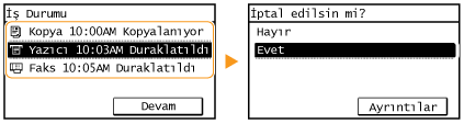 Uzak Kullanıcı Arabirimi'nden İptal EtmeYazdırmayı Uzak Kullanıcı Arabirimi'ndeki [İş Durumu] sayfasından iptal edebilirsiniz: Yazdırma Belgelerinin Geçerli Durumunu Kontrol Etme