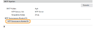 [SNTP Ayarları] bölümünde [Ayarlar/Kayıt]  [Ağ Ayarları]  [TCP/IP Ayarları]  [NTP Sunucusunu Kontrol Et] öğesine tıklayarak kayıtlı sunucudaki iletişim durumunu görüntüleyebilirsiniz. Uygun bir bağlantı kurulduysa, aşağıda gösterildiği gibi sonuç görüntülenir. Bu işlemin, sistem saatini ayarlamadığını unutmayın.