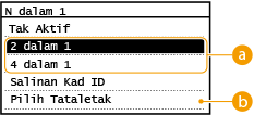 Menggunakan <N dalam 1> mengurangkan nisbah salinan secara automatik (nisbah salinan dipaparkan pada skrin). Anda boleh meningkatkan atau mengurangkan lagi nisbah salinan sebelum menekan
