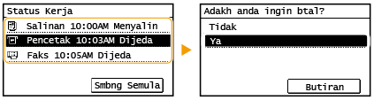 Membatalkan dari Remote UIAnda boleh membatalkan cetakan daripada halaman [Job Status] pada Remote UI: Menyemak Status Semasa Dokumen Cetakan