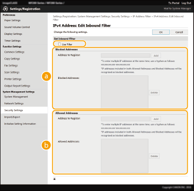 ถ้ามีการป้อนที่อยู่ IP ไม่ถูกต้อง คุณอาจไม่สามารถเข้าถึงเครื่องจาก Remote UI ซึ่งคุณต้องตั้งค่า <ตัวกรองที่อยู่ IPv4> หรือ <ตัวกรองที่อยู่ IPv6> เป็น <Off>