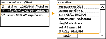 เมื่อตั้งค่า <แสดงรายการบันทึกงาน> เป็น <ปิด> คุณจะไม่สามารถตรวจสอบไฟล์บันทึกข้อมูลการพิมพ์ได้ <แสดงรายการบันทึกงาน>