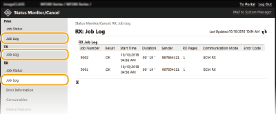 Lịch sử in, gửi fax/e-mail (TX), hoặc nhận fax (RX) sẽ được hiển thị.