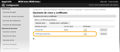 Una clave y un certificado no pueden eliminarse si se utilizan actualmente para algún fin, como cuando aparece "[TLS]" en [Uso de clave]. En este caso, deshabilite la función o sustituya la clave y el certificado antes de eliminarlos.