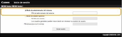 Introduzca el PIN apropiado en [PIN del administrador del sistema] para iniciar una sesión en Modo de administrador del sistema.
