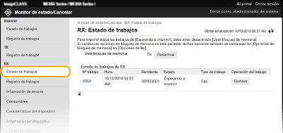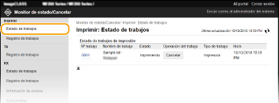 Haga clic en [Nº trabajo] para ver información detallada y una vista preliminar de un documento en espera de impresión.