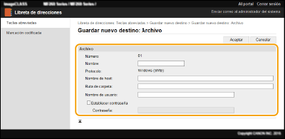 Podrá usar el ordenador para registrar destinos en la libreta de direcciones del equipo y editar la información de los destinos registrados. Especifique la carpeta compartida de destino aquí.