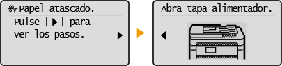 En algunos casos, cuando se produce un error, aparecen instrucciones sobre cómo responder ante dicho error. Siga las instrucciones de la pantalla para solucionar el problema. La pantalla que aparece cuando se produce un atasco de papel se muestra a continuación a modo de ejemplo.
