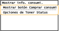 Establezca si se mostrará un botón en la IU remota o Toner Status para acceder al sitio web para comprar cartuchos de tóner, etc. Configure también si se utilizará o no Toner Status. Esta opción se mostrará como <Mostrar inform. consumib. (Toner Status)> dependiendo del modelo que esté utilizando.