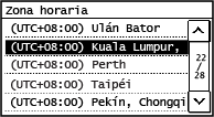 Configure <Zona horaria> antes de configurar la fecha y la hora actuales. Si la opción <Zona horaria> se modifica más tarde, la fecha y la hora actuales también se modificarán.