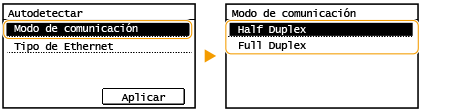 Envía y recibe datos de comunicación de forma alternativa. Seleccione cuándo se conecta el equipo a un dispositivo de red utilizando half-duplex.
