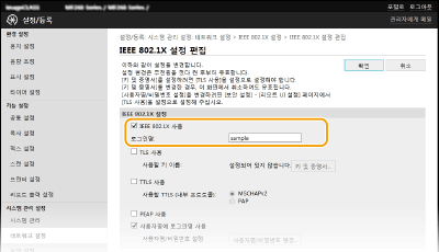 조작 패널 사용<메뉴> 화면에서도 IEEE 802.1X 인증을 활성화 또는 비활성화할 수 있습니다. <IEEE 802.1X 설정>
