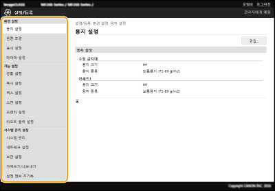 리모트 UI를 사용하여 다양한 기기 설정을 변경할 수 있습니다. 대부분의 설정을 기기에서도 설정할 수 있지만 일부 설정은 리모트 UI를 사용하여서만 설정할 수 있습니다. 이 단원에서는 리모트 UI를 사용하여 기기의 설정을 변경하는 기본 흐름을 설명합니다.