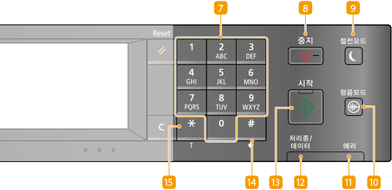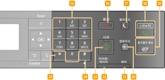 송신 또는 인쇄 등의 작업이 진행되는 동안 깜박입니다. 처리 대기 중인 문서가 있으면 켜집니다.