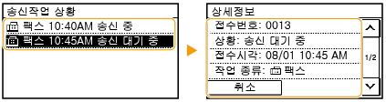 문서가 성공적으로 전송되거나 수신된 경우 <OK>가 표시되고, 취소되거나 오류가 발생하여 문서를 전송하거나 수신하지 못한 경우 <에러>가 표시됩니다.