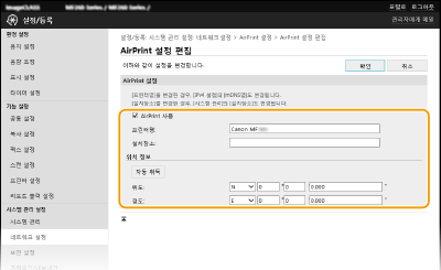 AirPrint로 인쇄 또는 팩스 전송을 수행할지 여부를 지정할 수 있습니다. 출고 시 기본 설정은 [설정]입니다.