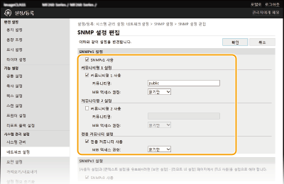 SNMP(Simple Network Management Protocol)는 MIB(Management Information Base)를 사용하여 네트워크의 통신 장치를 모니터링하고 제어하기 위한 프로토콜입니다. 본 기기는 SNMPv1 및 보안이 강화된 SNMPv3를 지원합니다. 문서를 인쇄하거나 리모트 UI를 사용할 때 컴퓨터에서 기기의 상태를 확인할 수 있습니다. SNMPv1 또는 SNMPv3를 각각 또는 동시에 모두 활성화할 수 있습니다. 네트워크 환경과 사용 목적에 맞게 각 버전의 설정을 지정합니다.