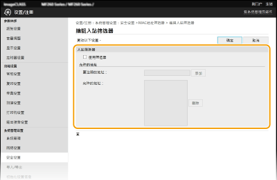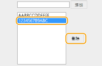 2 | 指定例外地址。 在 [要注册的地址] 文本框中输入 MAC 地址,然后单击 [添加]。 无需用连字符或冒号分隔地址。 ![]() 检查是否有输入错误 如果错误输入 MAC 地址,则可能无法从远程用户界面访问本机,此时需要将 <MAC地址筛选器> 设置为 <关闭>。<MAC地址筛选器> ![]() 从例外中删除 MAC 地址 选择一个 MAC 地址,然后单击 [删除]。 ![]() |
