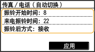 <自动> ![]() | 专门接收传真 本机将自动接收传真。即使有人打电话给您,也无法跟呼叫者通话。 |