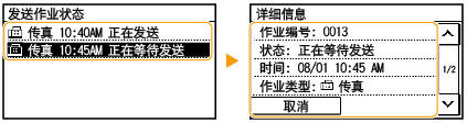 检查已发送和已接收文档的状态1 | 选择 <作业状态> 并选择您要检查状态的文档。 ![]() 显示文档的详细信息。 如果指定了多个接收方,画面上将显示指定的接收方数量。要查看指定的多个接收方的详细信息,请选择 <接收方数量>。 |