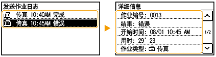 检查已发送和已接收文档的通信日志1 | 选择 <作业日志> 并选择您要检查状态的文档。 文档发送或接收成功时会显示 <完成>,文档发送或接收因取消或出现错误而失败时会显示 <错误>。 ![]() 显示文档的详细信息。 ![]() 如果 <结果> 栏显示一个三位数 此数字表示错误代码。 针对每个错误代码的应对措施 |