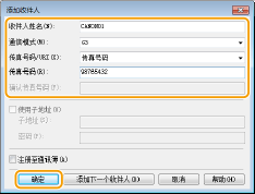 当 [确认传真号码] 或 [确认 URI] 字段激活时,也可在字段中输入相应的号码。在传真机驱动程序画面中可更改是否确认所输入号码的设置。更多信息,请单击传真机驱动程序画面上的 [帮助]。