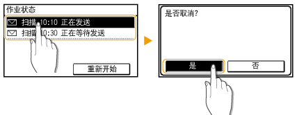 原稿已扫描并等待处理。选择要取消的文档,然后选择 <是>。