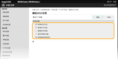 2 | 根据需要配置设置。 ![]() [使用WSD打印] 选择此复选框可通过 WSD 打印。不使用 WSD 打印时,请取消选中此复选框。 [使用WSD浏览] 选择此复选框可通过 WSD 从计算机获取关于本机的信息。当选择 [使用WSD打印] 复选框时,将自动选择此复选框。 [使用WSD扫描] WSD 扫描可将文档扫描到计算机,而无需安装扫描仪驱动程序。选中此复选框可通过 WSD 扫描文档。不使用 WSD 扫描时,请取消选中此复选框。 [使用计算机扫描] 选中此复选框,可以通过使用操作面板操作本机的方式来使用 WSD 扫描。只有当 [使用WSD扫描] 复选框被选中之后才能选中该复选框。要执行扫描,请选择主页画面中的 <扫描> 或按下 (复印/扫描)键,然后将 WSD 连接的计算机指定为扫描接收方(扫描并保存到计算机)。[使用多路传送发现] 选择此复选框可将本机设置为回复多路传送发现讯息。如果取消选择此复选框,即使多路传送发现讯息在网络上传播,本机也将保持睡眠模式。 |