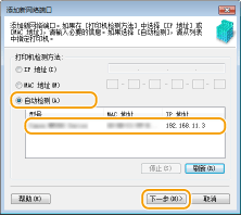3 | 选择 [自动检测],当检测到本机时选择本机,然后单击 [下一步]。 ![]() ![]() 如果未检测到本机 单击 [刷新]。如果问题仍然存在,请选择 [IP 地址] 或 [MAC 地址],输入本机的 IP 地址或 MAC 地址 (查看网络设置),然后单击 [下一步]。 |