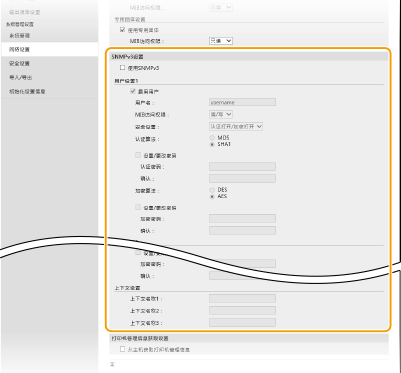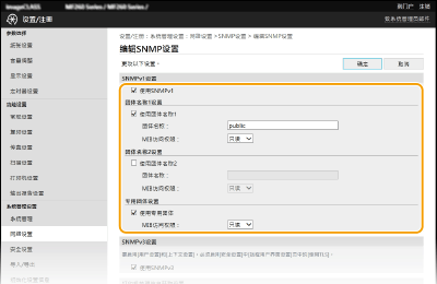 简单网络管理协议(SNMP)是用于通过管理信息库(MIB)监视和控制网络中通信设备的协议。本机支持 SNMPv1 和安全性增加的 SNMPv3。当您打印文档或使用远程用户界面时,可以从计算机检查本机的状态。您可以启用 SNMPv1 或 SNMPv3,或同时启用两者。根据您的网络环境和用途指定各版本的设置。