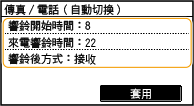 可以將本機設定為在指定時間內來電響鈴時自動接收傳真。<切換至自動接收>