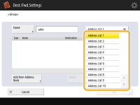 1 | Selecione os destinos que deseja registrar em um grupo e pressione <OK>. ![]() Botão do tipo destinoSelecione (e-mail), (fax), (I-fax) ou (arquivo) para filtrar os destinos exibidos na lista de endereços ( ). Pressione <All> para exibir todos os destinos registrados. DestinoOs destinos registrados na lista de endereços que você selecionou na etapa 6 serão exibidos. Nessa lista, selecione os destinos que deseja registrar em um grupo. ![]() Quando os destinos são gerenciados pelos números de acesso, eles não são exibidos na lista a menos que você insira o número de acesso (Restringindo o acesso a destinos registrados no Catálogo de endereços) após pressionar <Access No.>. <Details/Edit>Selecione um destino e pressione <Details/Edit> se deseja conferir as configurações do destino. Pressione <OK> para retornar à página anterior. <Search by Name>Insira o nome do destino. Pressione <Search by Name> novamente para retornar à página anterior. Botão da primeira letraSelecione o botão alfanumérico para o primeiro caractere do nome do destino. Pressione <All> para exibir todos os destinos registrados. |