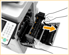 ![]() | Abra a guia do conjunto de fixação. Se o papel estiver encravado, puxe-o cuidadosamente na direção da seta. ![]() ![]() Se o papel estiver parcialmente fora do lado de baixo (lado de entrada) do conjunto de fixação, puxe o papel para baixo cuidadosamente. |