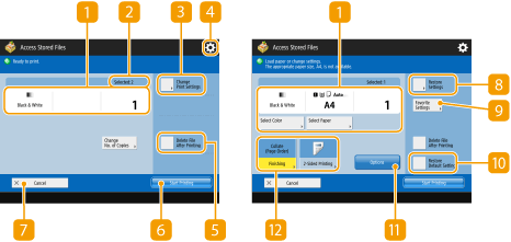 Ao pressionar <Access Stored Files> na tela do <Main Menu> e depois pressionar <Mail Box>, <Advanced Box>, <Network> ou <Memory Media> para imprimir arquivos, a seguinte tela de configuração será exibida.