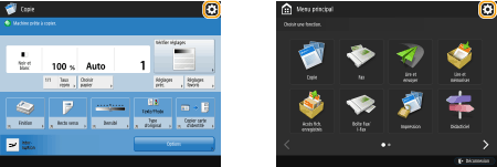 Appuyez sur la touche  affichée dans le Menu principal et sur l'écran des fonctions de base pour personnaliser l'écran, par exemple en réorganisant les touches ou en créant une touche de raccourci. Seul un administrateur peut personnaliser le Menu principal. Personnalisation de l'afficheur tactileVous pouvez modifier les paramètres d'affichage, notamment en définissant l'écran qui doit apparaître lorsque l'appareil est mis sous tension ou en indiquant si le message de niveau de papier ou de toner doit apparaître. <Réglages d'affichage> |