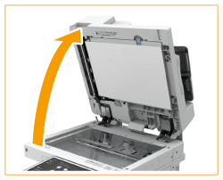 Quando colocar originais finos de 11" x 17", LTRR, A3, ou A4R no alimentador, levante a Trava de originais para evitar que os originais digitalizados enruguem.