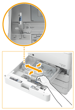 ![]() | Ao pressionar a parte superior da guia frontal, deslize-a para alinhar com o indicador de tamanho do papel carregado. ![]() ![]() |