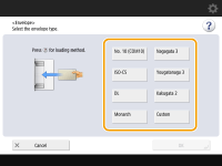2 | Selecione o tipo de envelopes. ![]() Para registrar um envelope de tamanho personalizado, pressione <Custom Size> <Next> e pressione <X> ou <Y> para especificar o lado, em seguida, use as teclas numéricas para inserir o comprimento do lado especificado.Pressione <OK> e prossiga para a etapa 5. |