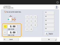 Pressione <X> ou <Y> e insira o comprimento de cada lado usando as teclas numéricas. ![]() Se você registrar o tamanho de papel que usa com frequência nos botões <S1> como <S5>, poderá acioná-lo com um único botão. Registrando papel sem tamanho (papel de tamanho personalizado) | |