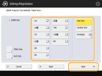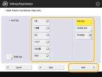 2 | Selecione o tipo de envelopes. ![]() Para registrar um envelope de tamanho personalizado, pressione <Custom> <Next> e pressione <X> ou <Y> para especificar o lado, em seguida, use as teclas numéricas para inserir o comprimento do lado especificado. |