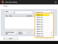 1 | Selecione os destinos que deseja registrar em um grupo e pressione <OK>. ![]() Botões de tipo de destinoSelecione (e-mail), (fax), (I-fax) ou (arquivo) para filtrar os destinos exibidos na lista de endereços ( ). Pressione <All> para exibir todos os destinos registrados. DestinoOs destinos registrados na lista de endereços que você selecionou na etapa 6 serão exibidos. Nessa lista, selecione os destinos que deseja registrar em um grupo. ![]() Quando os destinos são gerenciados pelos números de acesso, eles não são exibidos na lista a menos que você insira o número de acesso (Restringindo o acesso a destinos registrados no Catálogo de endereços) após pressionar <Access No.>. <Details/Edit>Selecione um destino e pressione <Details/Edit> se deseja conferir as configurações do destino. Pressione <OK> para retornar à página anterior. <Search by Name>Insira o nome do destino. Pressione <Search by Name> novamente para retornar à página anterior. Botão da primeira letraSelecione o botão alfanumérico para o primeiro caractere do nome do destino. Pressione <All> para exibir todos os destinos registrados. |