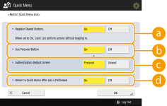 <Authentication Default Screen>Você pode selecionar se os Botões pessoal ou compartilhado serão exibidos primeiro assim que um usuário que realiza o login exibir o Menu rápido quando os dois tipos de botão estiverem disponíveis.