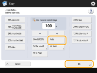 Ao copiar com razão de cópia igual em papel que tem o mesmo tamanho do documento original, as extremidades do documento copiado poderão não aparecer. Para evitar isso, reduza o documento pressionando <Copy Ratio> <Fit to Page> para obter as extremidades faltantes do documento.Se você selecionar <Fit to Page>, <Shift> será automaticamente configurado como <Center>. Não é possível digitalizar originais altamente transparentes, como transparências, usando a configuração Auto como Taxa de Cópia. Em vez disso, use o Zoom Predefinido ou o modo de Zoom por porcentagem. Se configurar <Auto>, você precisará selecionar um tamanho de papel manualmente. Se você não selecionar um tamanho de papel, a taxa de cópia será ajustada automaticamente para corresponder ao tamanho do papel carregado na gaveta de papel 1. Ao definir as configurações em <Scan and Store>Você não pode especificar <Fit to Page> quando armazena documentos na Caixa de Mensagem. |