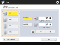 Se <Gutter> estiver configurado como <N on 1> (Copiando múltiplos originais em uma folha (N em 1)), a margem especificada para o lado frontal será aplicada aos dois lados. A margem especificada para o lado traseiro não será aplicada.
