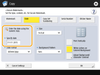 2 | Configure as datas para incorporar. As datas configuradas na máquina são exibidas em <Specify date>. Para incorporar outras datas, insira usando as teclas numéricas. |
