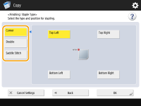 Para grampear na seção onde o papel é dobrado ao meio, selecione <Saddle Stitch>. Dependendo da opção, você pode anexar uma capa ou alterar a posição da dobra. Quando realiza o acabamento das bordas das folhas de saída, você pode ajustar a posição do acabamento.