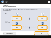 Para reduzir ondulações ao copiar originais que contêm fotos impressas, como revistas e panfletos, ajuste o controle em <Photo/Image> como <Low>.