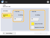 Se você deseja mover a imagem do verso ao copiar em frente e verso, a configuração <Back Side> é necessária. Para mover para a mesma posição da frente, pressione <Same as Front Side>. Para mover simetricamente, pressione <Opposite to Front Side>. Para mover para uma posição diferente da frente, pressione <Set> e insira a distância do deslocamento.