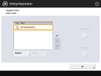 Para alterar o nome de uma imagem de forma já registrada, selecione a imagem de forma na lista na etapa 5 e pressione <Details>  <Rename Form>. Para excluir a imagem de forma, selecione a imagem na lista e pressione <Delete>. Você pode registrar até 100 formas de imagem. No entanto, esse número varia dependendo da capacidade do disco rígido. |