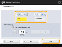 Para sobrepor a imagem de forma sem ajustar a densidade, pressione <Solid>. Para sobrepor a imagem de forma com a densidade diminuída, pressione <Transparent> e ajuste a densidade.
